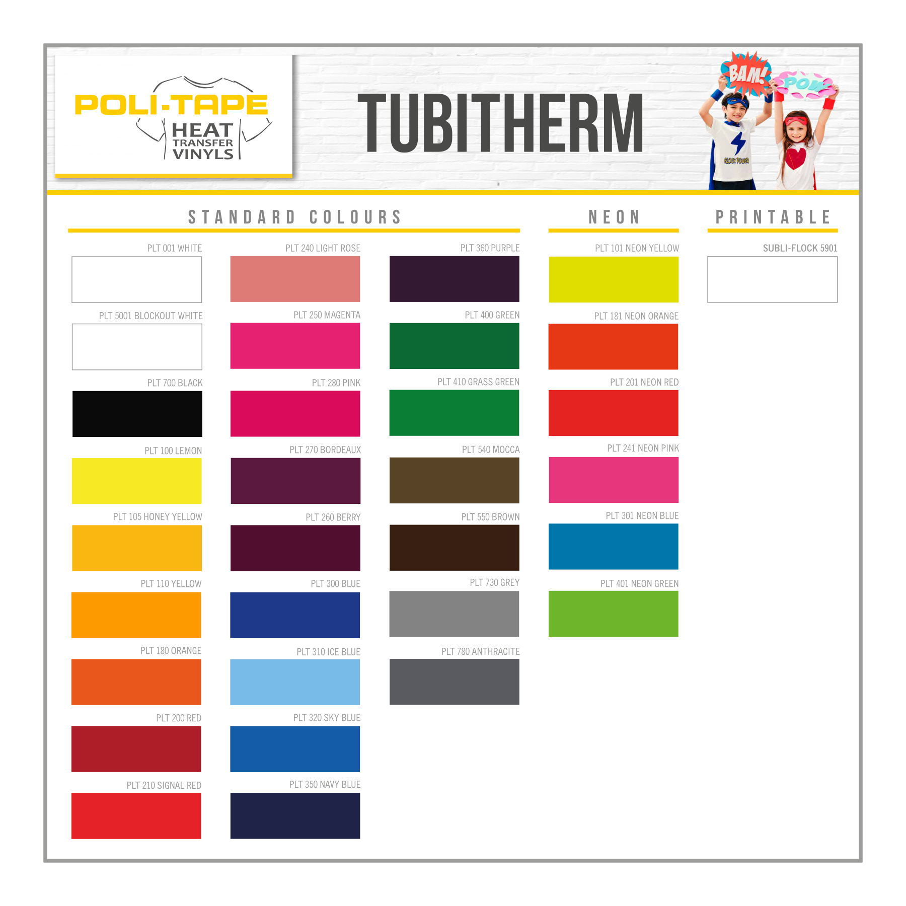 POLI-FLEX TUBITHERM® is een hoogwaardige thermotransfer flockfolie. De flockdraden hebben een zeer hoge densiteit waardoor de transfers zacht en fluweelachtig aanvoelen. De briljante kleuren geven een mooie beeldkwaliteit. TUBITHERM® kan gebruikt worden voor toepassingen op kleding als uniformen, werk-, sport- en vrije tijdkleding en heeft een voortreffelijke wasbestendigheid.